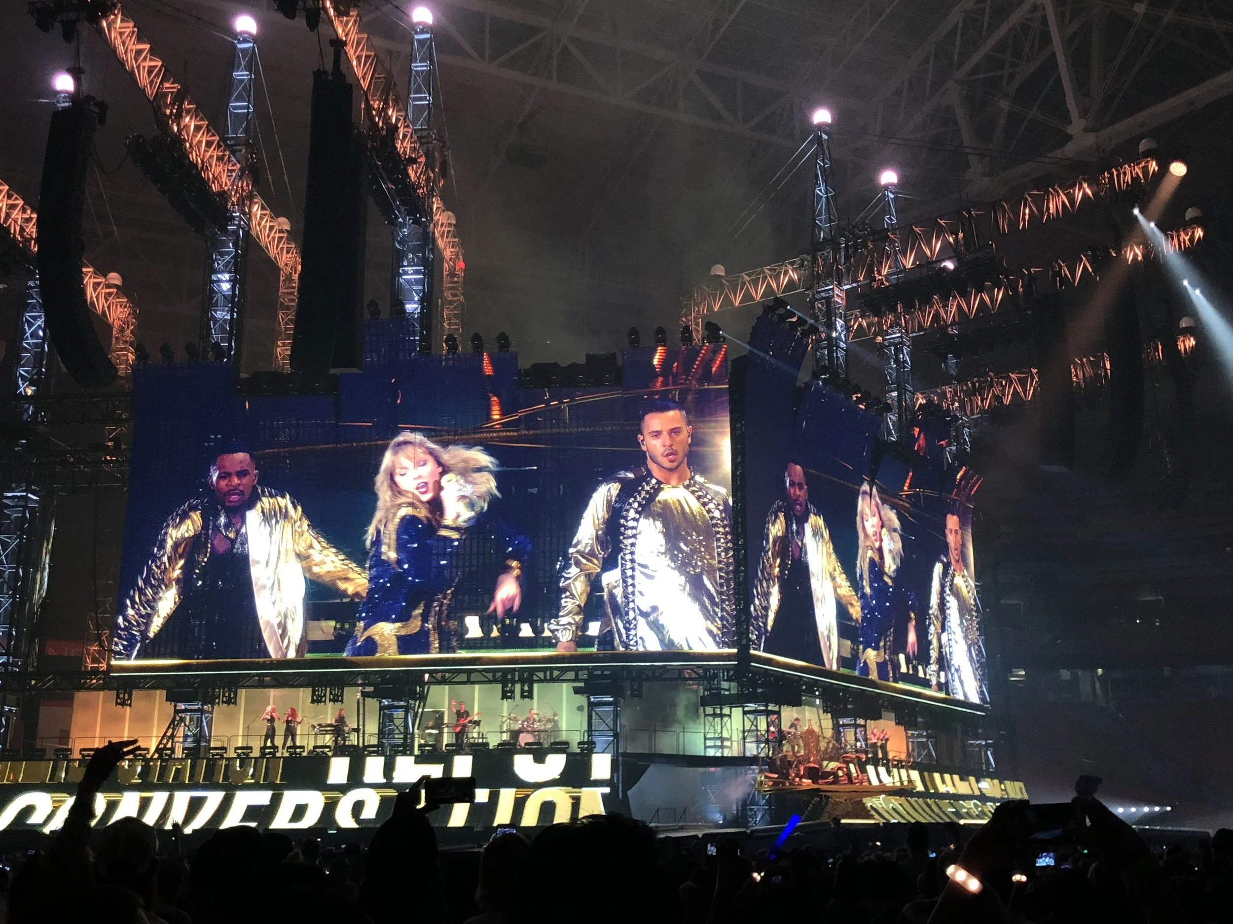 There were a few decent moments. “Cry Me a River” seemed filled with the right amount of edge and angst. The visuals projected on the scrims worked well and for me, this was the best of the show. “Mirrors” and “SummerLove” also reminded me why I liked JT in the first place. The retractable scrims provided makeshift screens that were occasionally used to accentuate the music (but all too often just showed a variety of trees…yeah we get it. Man of the Woods). While Timberlake did his best with these few songs, the sound wasn’t great. The arena was set up for a concert in the round, but the speakers provided an unclear sound for the majority of the show. One interesting touch was the campfire at the end of the arena. We didn’t have a great view of it but it was a nice idea. Unfortunately, it took JT and his team about 5 minutes (and a round of shots) in order to set up their acoustic set.